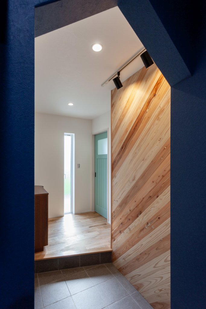 玄関ホールにはアクセントで屋久島地杉を斜めに貼りました