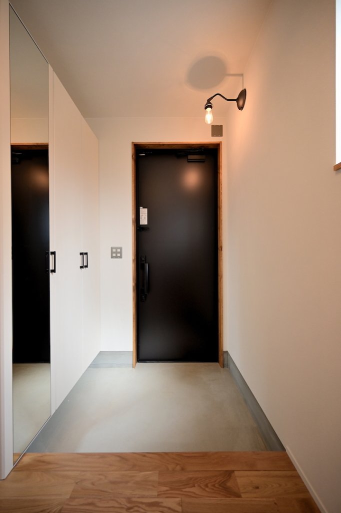 有孔ボードの色は、建具とキッチン収納の色に合わせて統一感を出しています