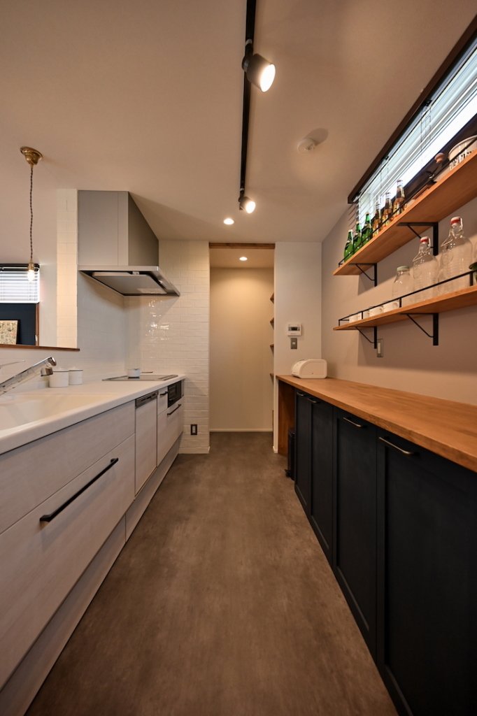 カウンターの上に設置した造作棚はアイアンの落下防止バーが付いており