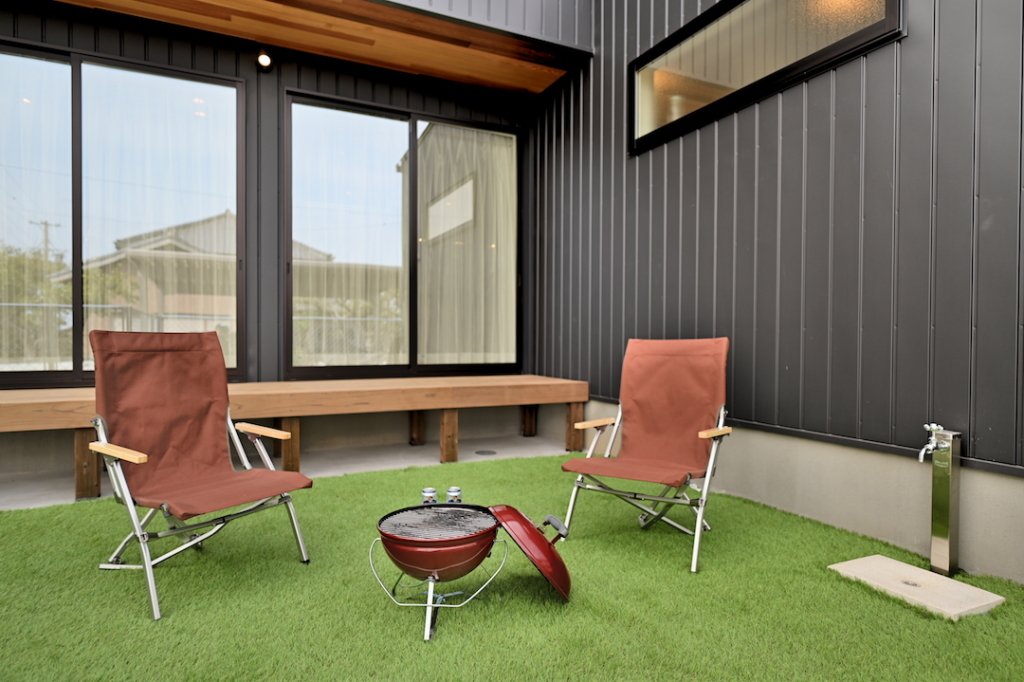 芝の緑色が建物に映えるお庭でバーベキューなどのアクティビティも楽しめます