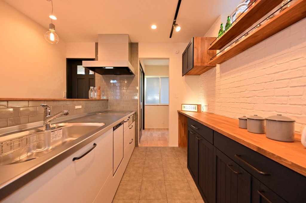 背面壁はヨーロッパ産の漆喰をレンガ風に施工しました