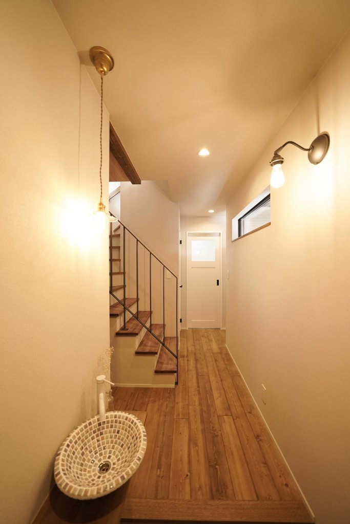 モザイクタイルの手洗いボウルが目を引く玄関。感染症対策に効果的な「ただいま手洗い」の習慣を。