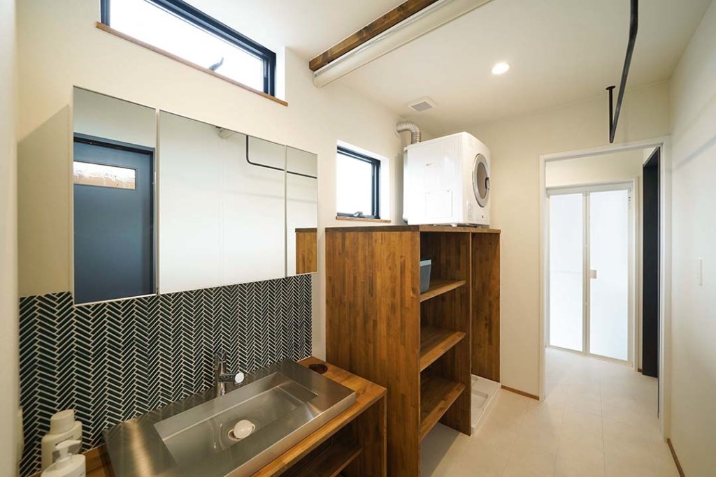 ホロスホームオリジナルの造作化粧洗面台・造作棚のある洗面室・ランドリールーム。