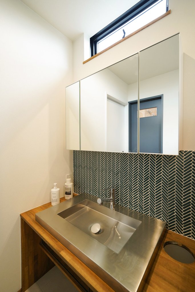 ヘリンボーン柄に施工されたタイルの壁を、ステンレスの洗面台とコーディネート。