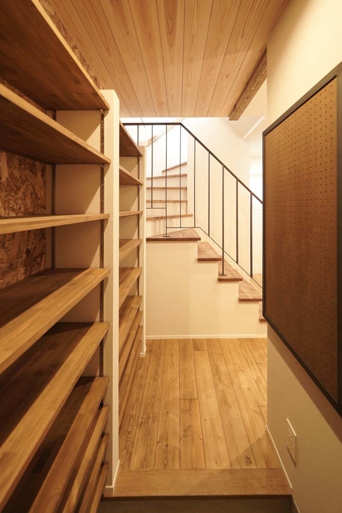 靴を履いていても、脱いだ後も使える玄関の収納スペース。散らかりがちな靴をすっきり収納できます。