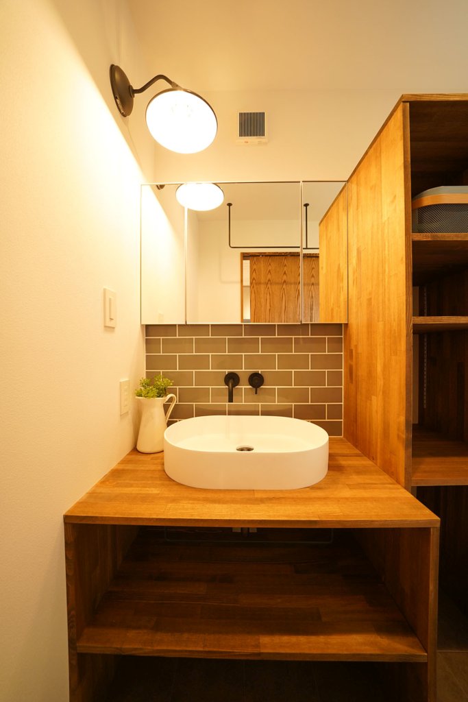 変わった壁出し水栓がアクセントの造作洗面化粧台。ころんとした形が個性的な洗面ボウルと相性ぴったり。
