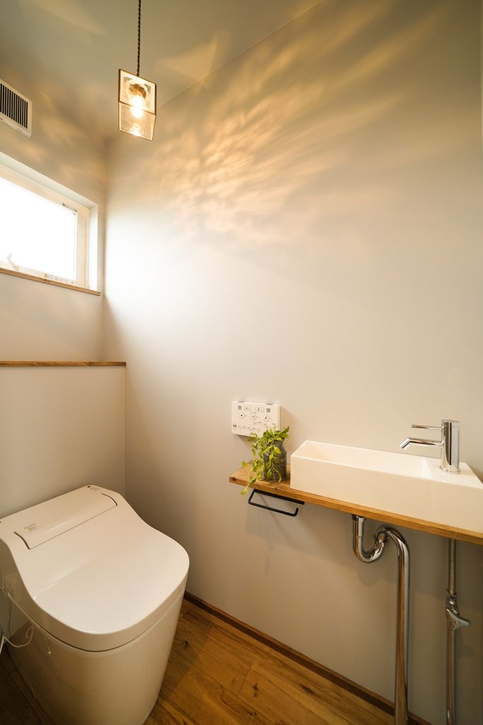 照明が映える、シンプルなトイレ。LDKのデザインと体裁を合わせ、統一感を持たせています。