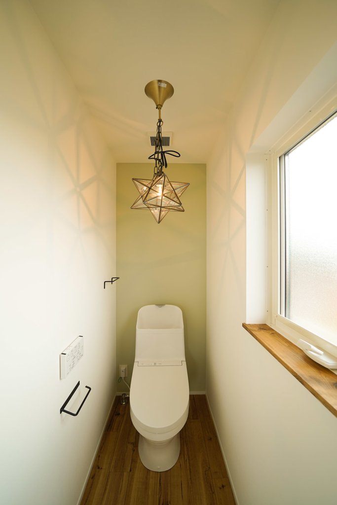 子供部屋と同じく、1面だけカラークロスを使用したトイレ。大きな照明とも調和しています。