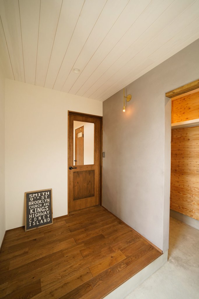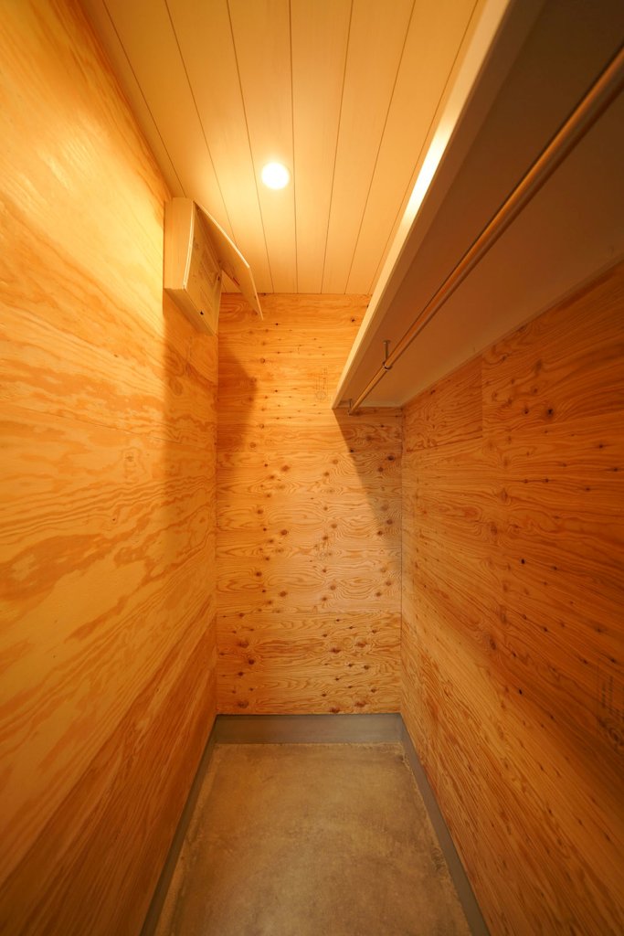 モルタル金鏝仕上げの土間。土間収納はコートやジャケットをかけるバーを設置。