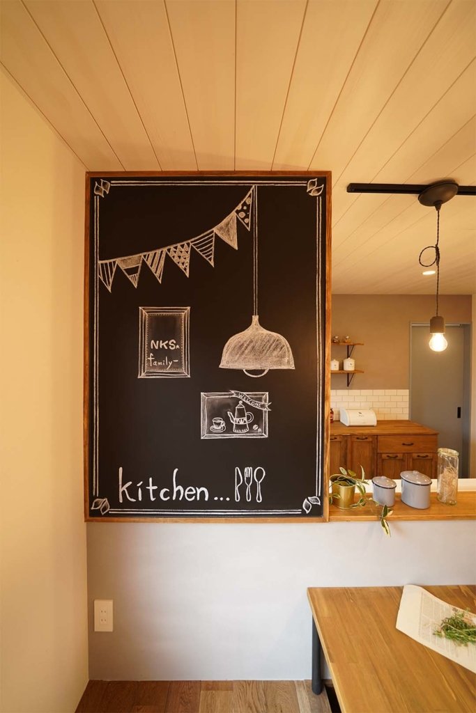 テーブル近くの壁面にある黒板は家族の予定を書くもよし、アートを描くのもよし。
