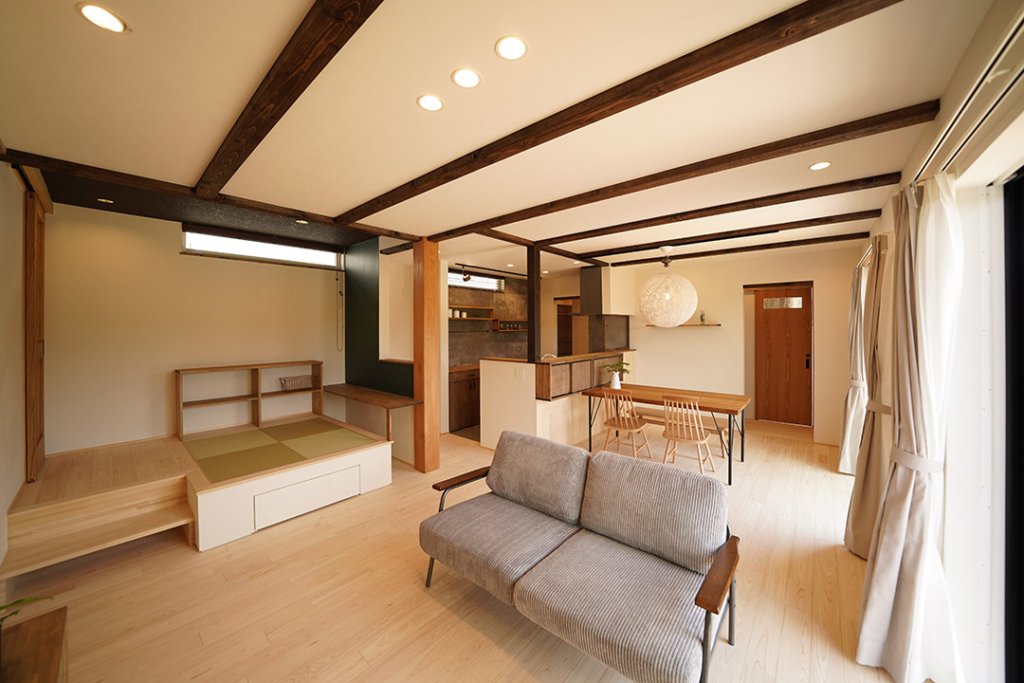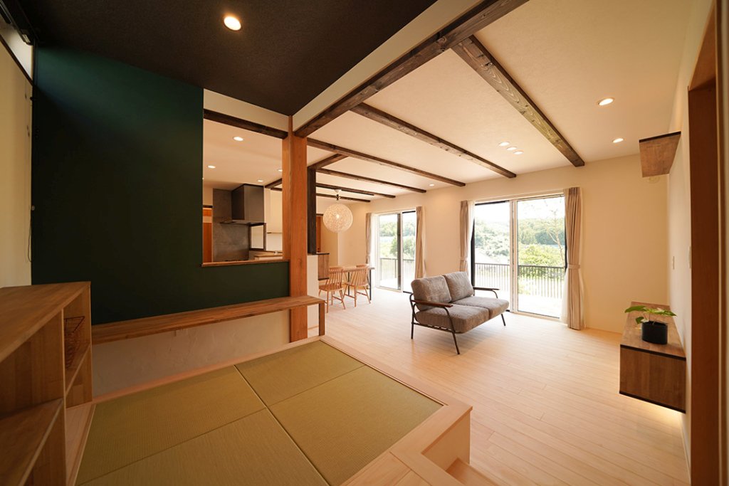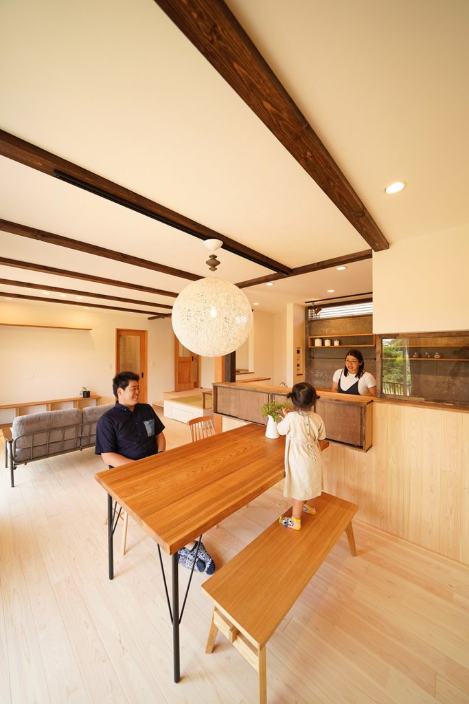 ウッドデッキへつながる大きな窓から、柔らかな光が差し込みます。