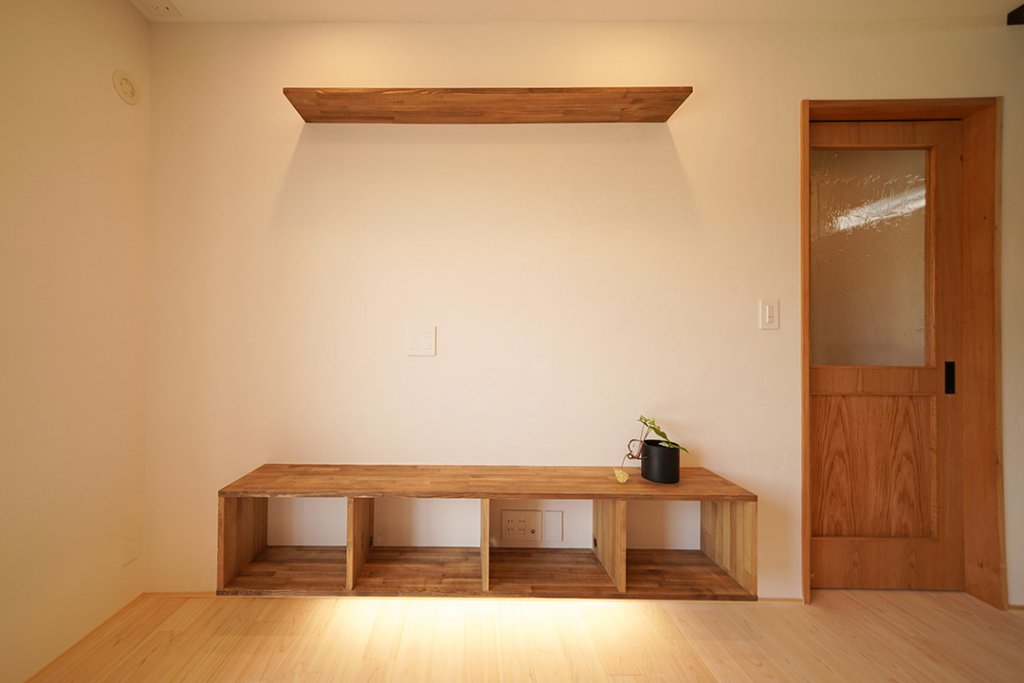 造作のテレビ台。楽に掃除ができるように、床から離して間接照明を取り付けました。