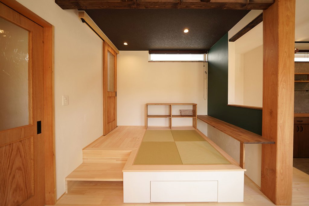 キッチンから見渡せる、スタディースペース。緑の壁は黒板になっています。
