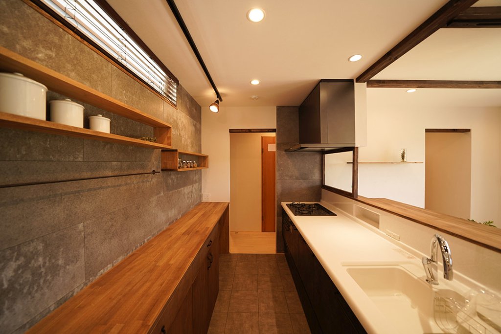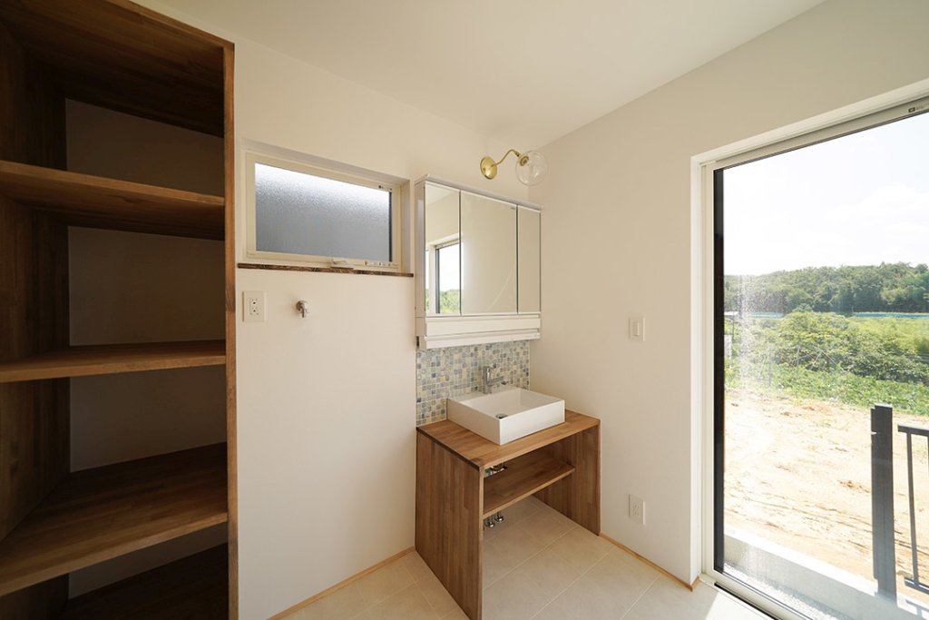 防水性が高く、お手入れもしやすい壁面タイルのある造作洗面化粧台。