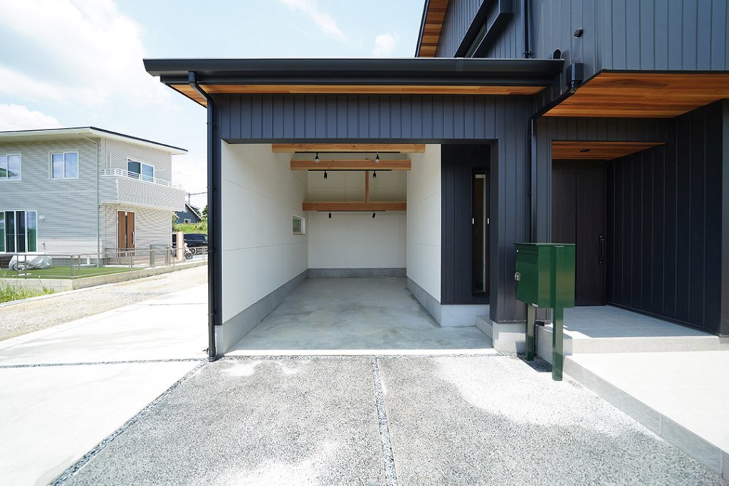 インナーガレージの床はモルタル仕上げ。車から濡れずに玄関まで行くことができます。