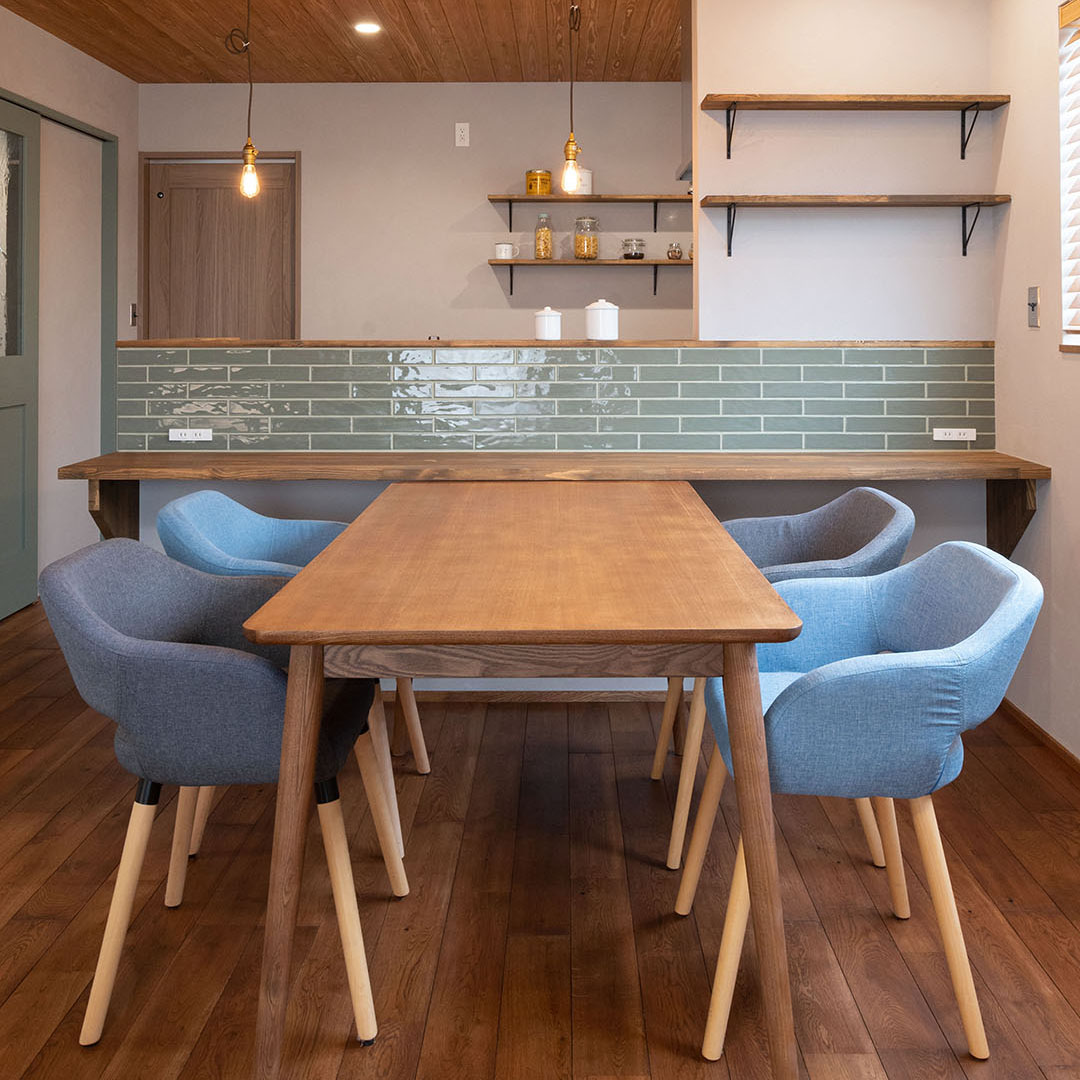 リビングの扉と同じミントグリーンのサブウェイタイルが印象的なLDK。