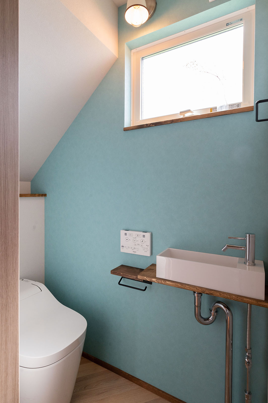 水色のクロスがアクセントのトイレ。