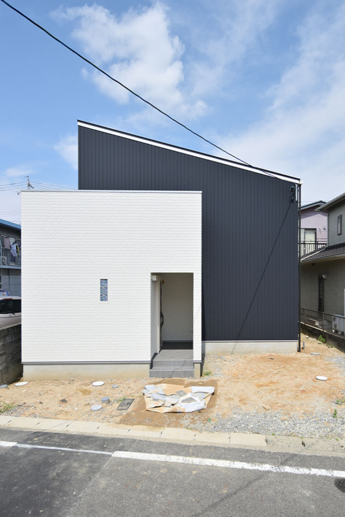 ブラックのガルバリウムと、ホワイトのサイディングを組み合わせた外観。