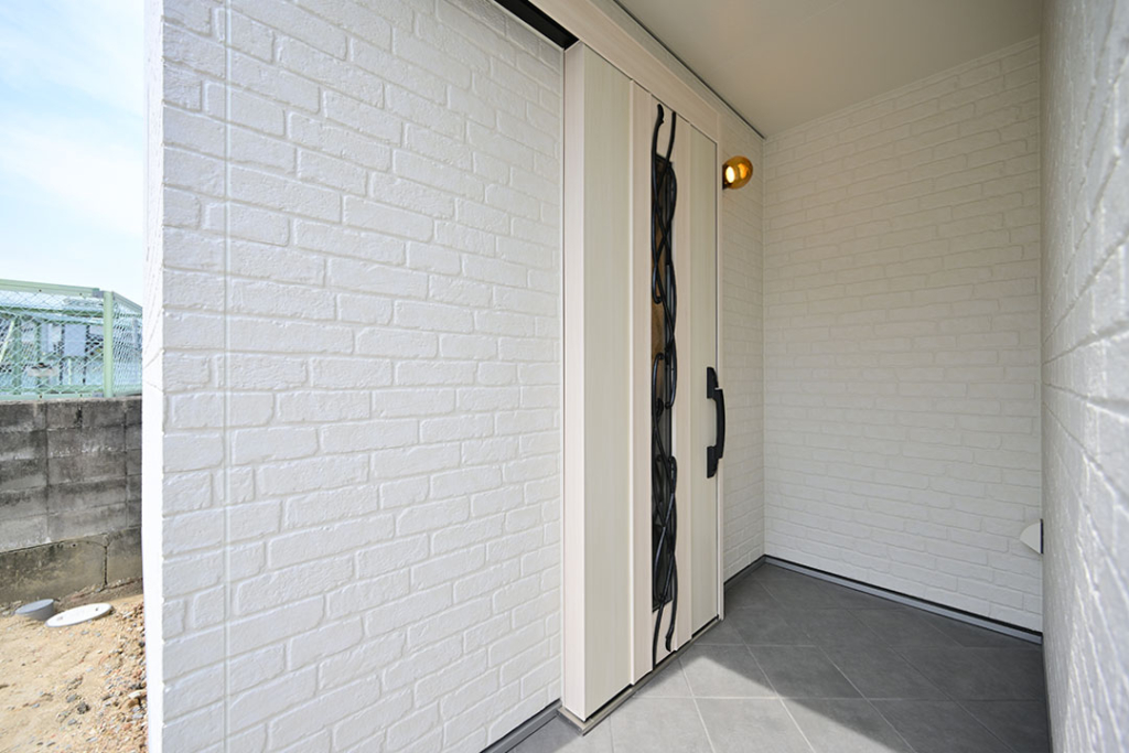 ポーチとたたきのタイルは色を変え、菱方に敷きアジアンな印象を強調!