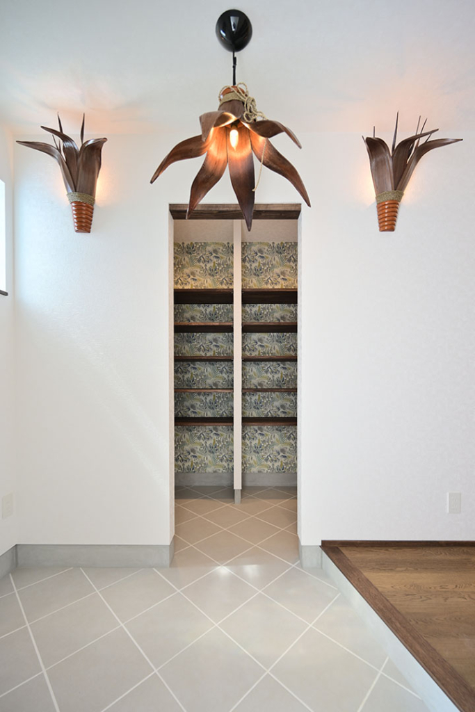 玄関戸は引き戸で使い勝手よく、アジアンテイストにあうデザイン。