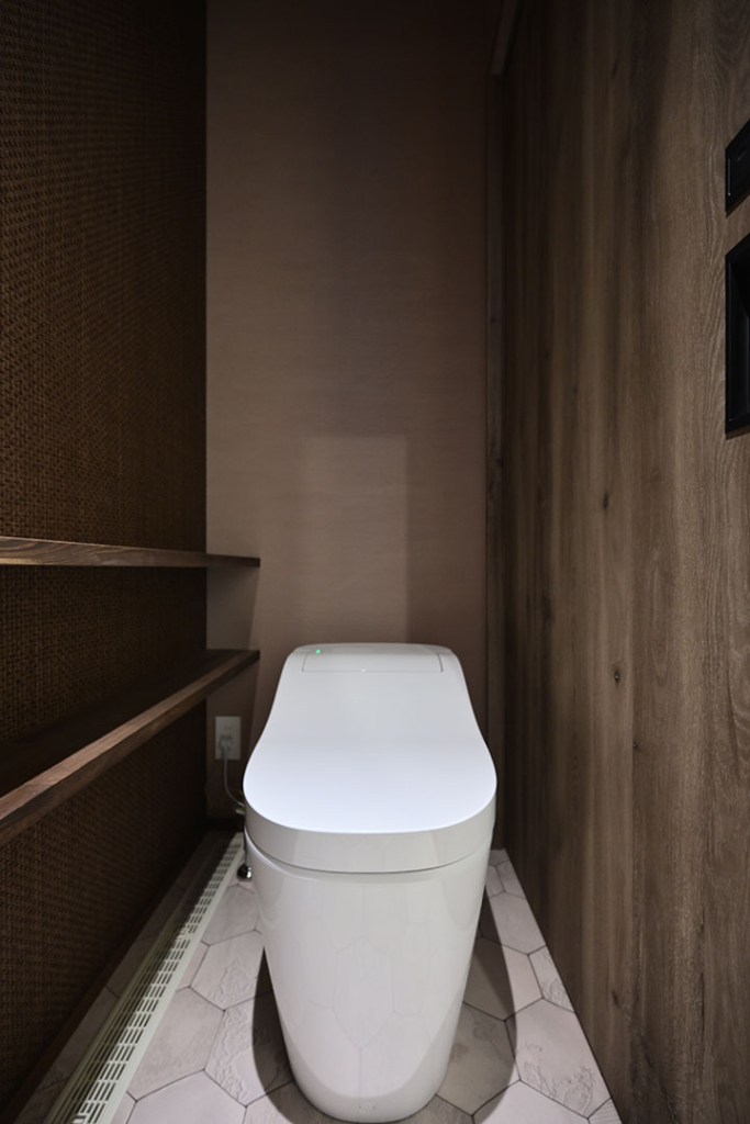 1Fのトイレにはバリ島の人気の工芸品のような編み目が特徴のアクセントクロスを採用。