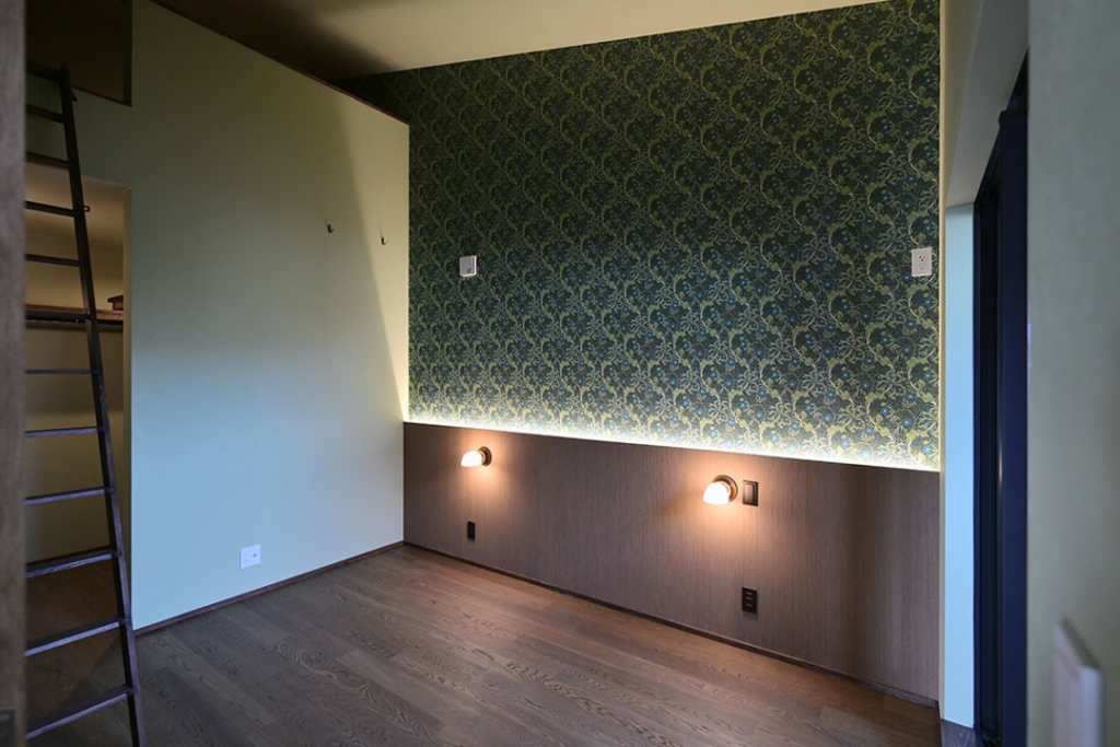 間接照明とアクセントクロスで落ち着きのある空間。