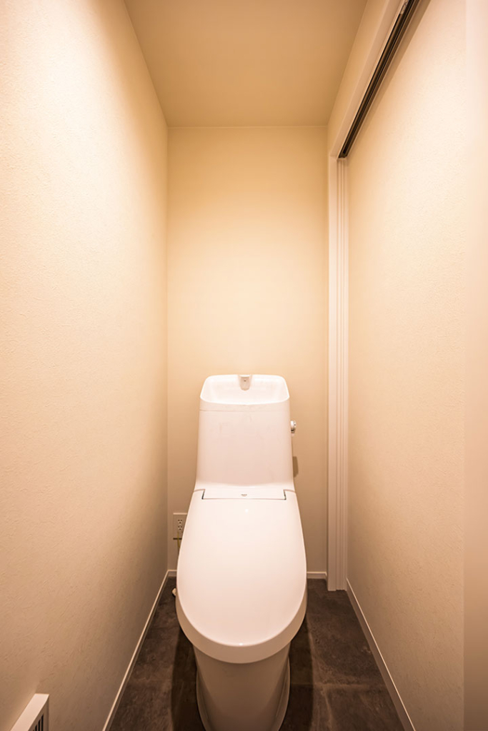 シンプルにまとめられた1Fのトイレ。暗めのクロスで落ち着く空間に。