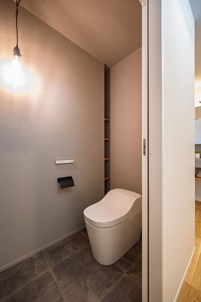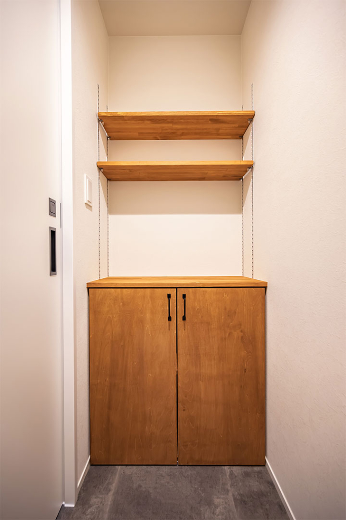 造作の戸棚は掃除道具を入れたり、トイレットペーパーをしまったりできます。
