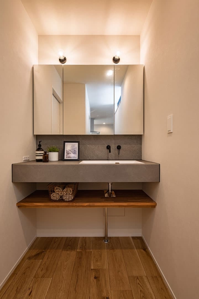 正面は大判タイルを使用して、すっきりとしたデザイン&壁出し水栓でお手入れも楽々。