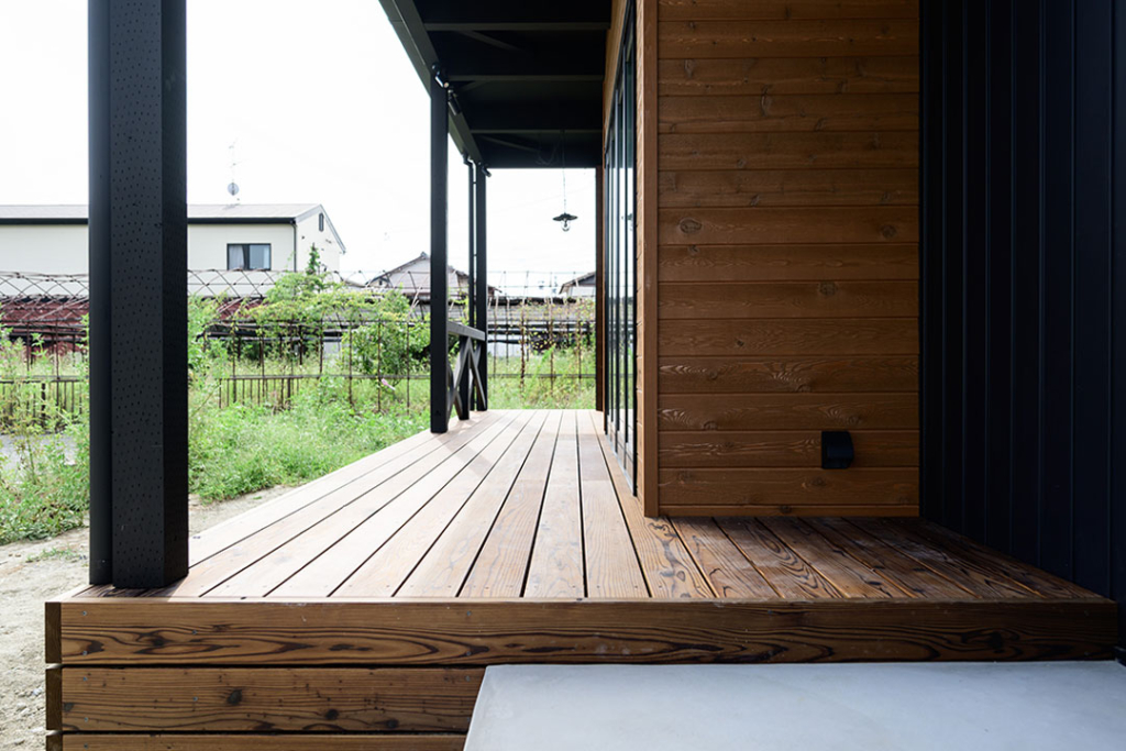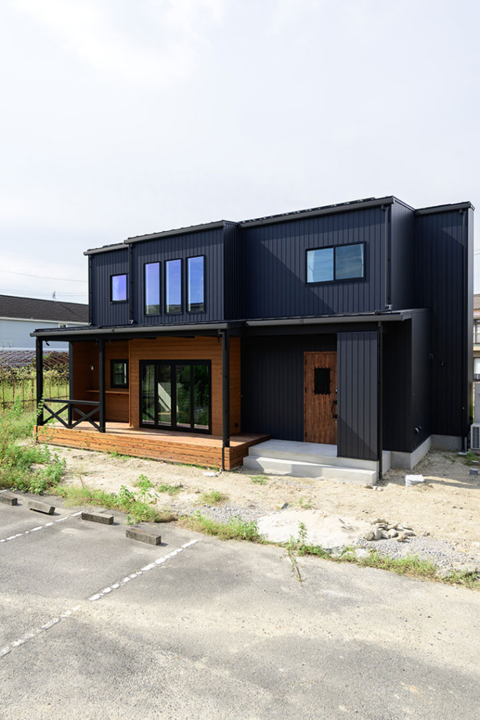 ブラックのガルバリウムと、レッドシダーで無骨なかっこよさの外観。