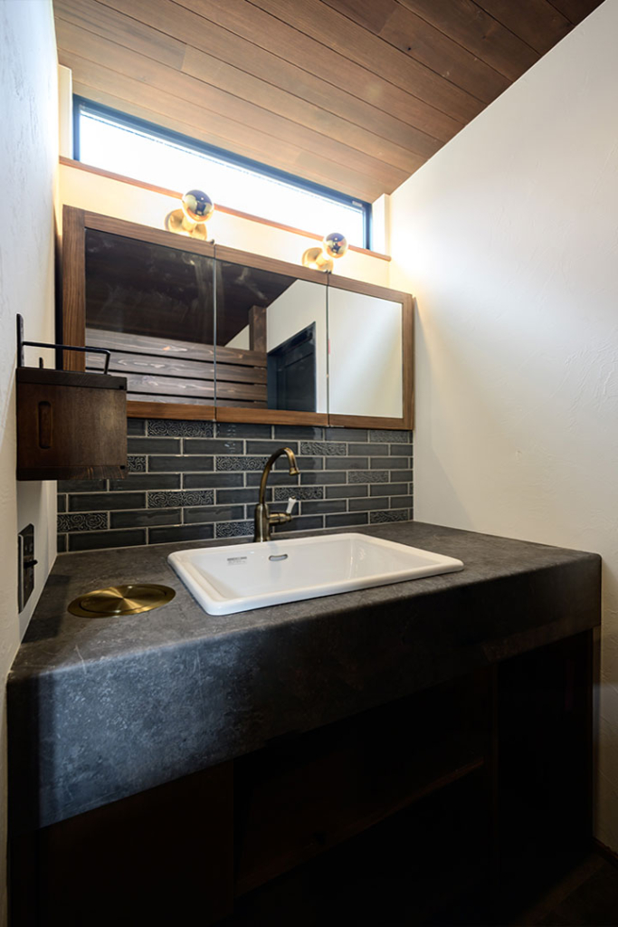 タイルは特別仕様のレリーフ入りと、既成のタイルをミックスで張ってレトロヴィンテージ感をアップ。