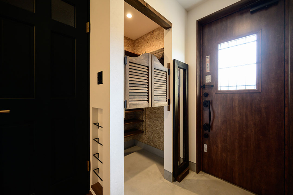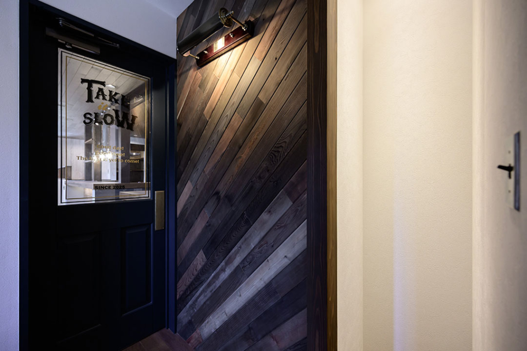 玄関正面は、エイジングシダーを斜め張りにしてカッコよく。