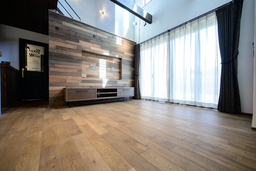 テレビ背面はプレイリーホームズのエイジングシダーを貼って唯一無二の風合いに。