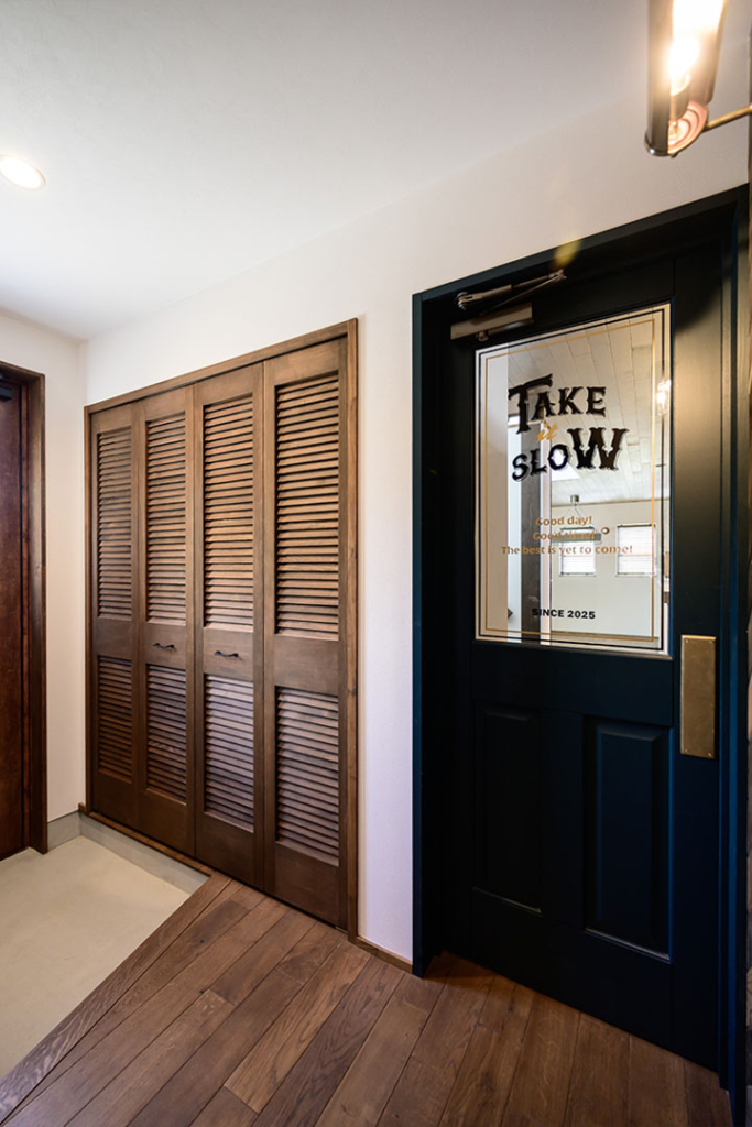 玄関から見えるトイレドアと雰囲気を合わせるため、框+ガラスのデザインにしています。