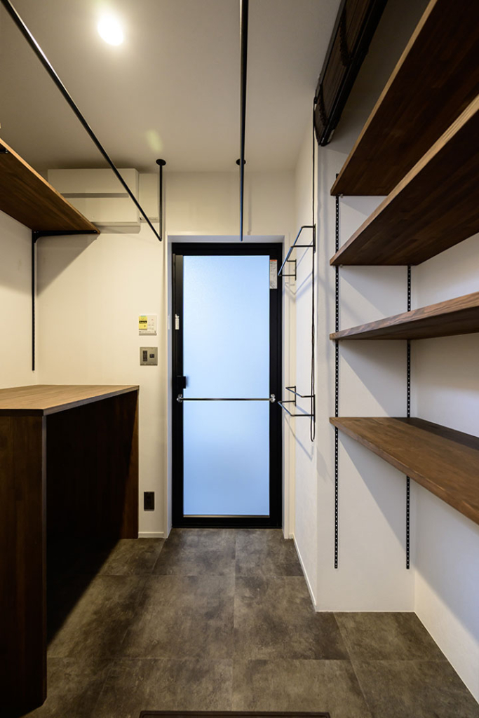 その他にも作業台や可動棚、天井のアイアンバー等、家事のしやすさや収納にもこだわったスペースです。