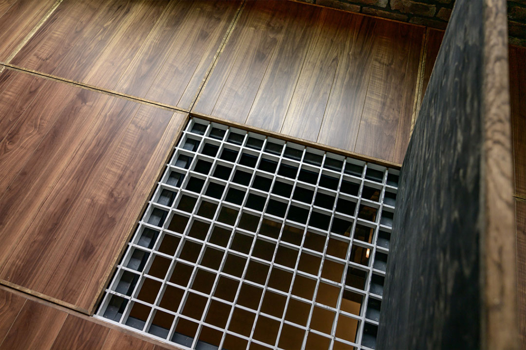 ガレージから続く吹き抜け部分には、LDKの床を確保するためグレーチングを設置。