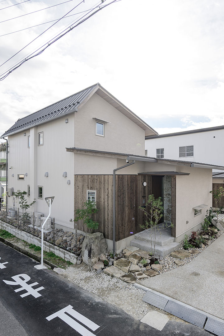 玄関アプローチは山道を登っていく感覚を狙って、もともとあった庭石をアクセントに自然の石を有機的に配置しています。