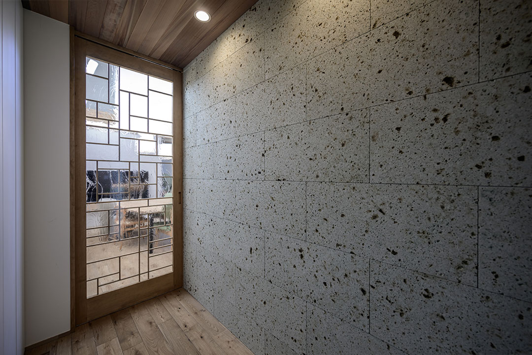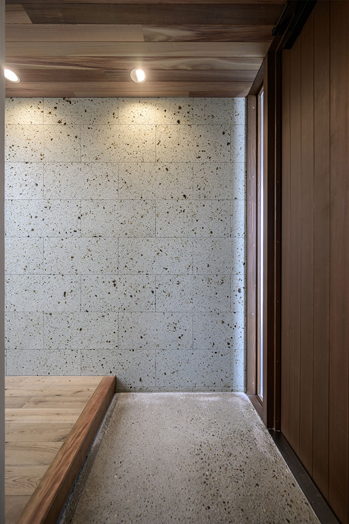 外壁と同じ仕上げの壁で内外のつながりを演出。