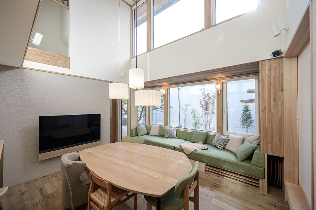 リビングは光を呼び込むため、間口いっぱいの窓とコイルスプリングの作り付けソファを設け、吹き抜けとの対比で天井も低くしデイベットとしてくつろぎの空間としました。
