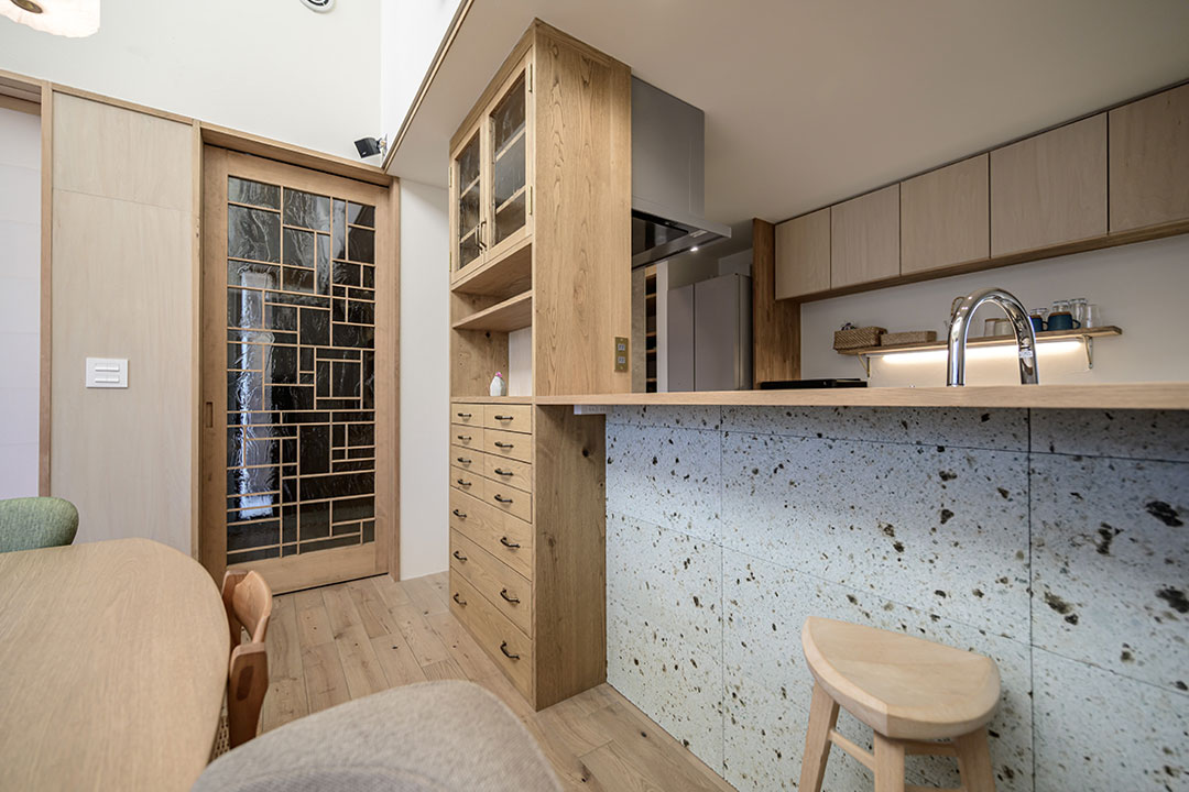 キッチン腰壁はアプローチと同じ大谷石を使用。外と内の繋がりを意識しています。