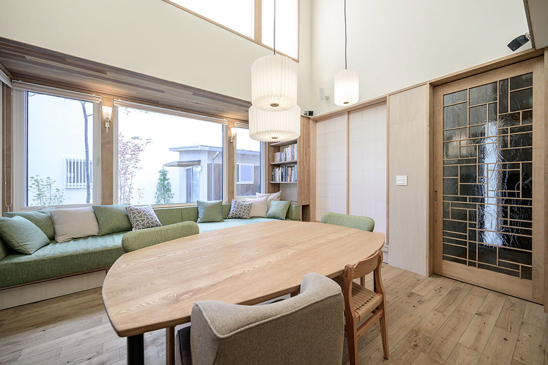 間口ぴったりの特寸サイズで造作し、窓のラインもそれに合わせて揃えることで、無駄のないすっきりとしたデザインに仕上げています。