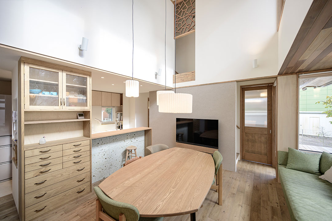 リビングとの一体感を保ちながら一段高さを変えることで、日常の中に特別な空気感を生み出す独立した空間として構成しています。