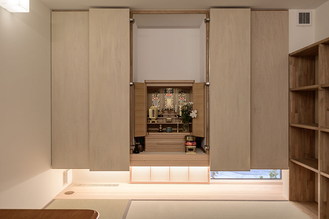仏壇スペースです。デザインやお家のテイストに違和感のないよう、建具の収まりを新規に開発して使い勝手とデザイン性を両立できるよう工夫しました。
