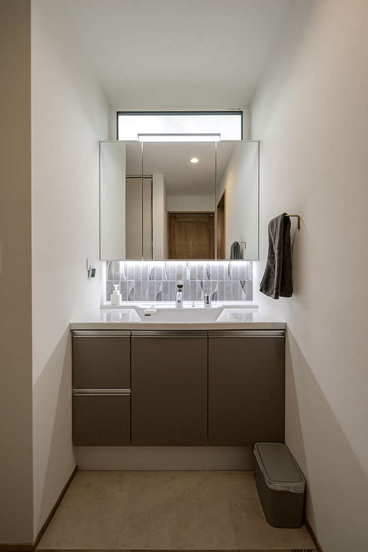 来客時も気兼ねなく使っていただけるよう、洗面台は脱衣室から独立させてホールに配置しました。