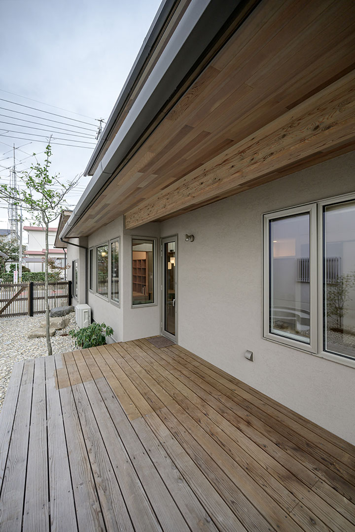 夏の日差しを遮るために設けた深い軒は、和モダンなテイストながらディティールをすっきりさせることにより北欧のテイストも感じられるようにデザイン。
