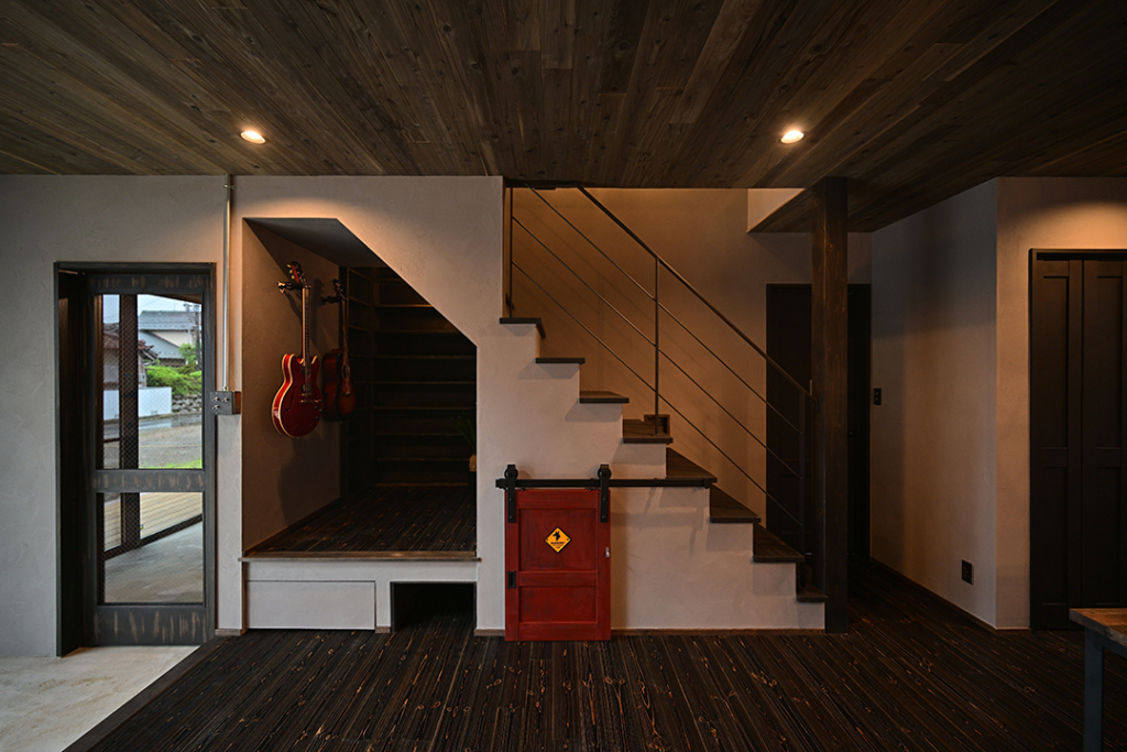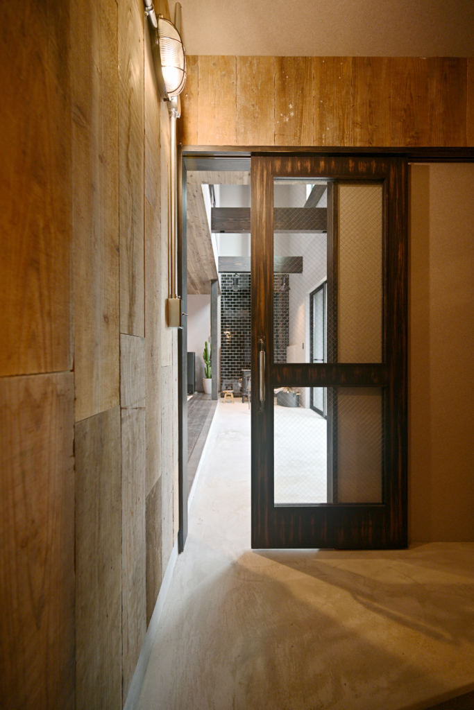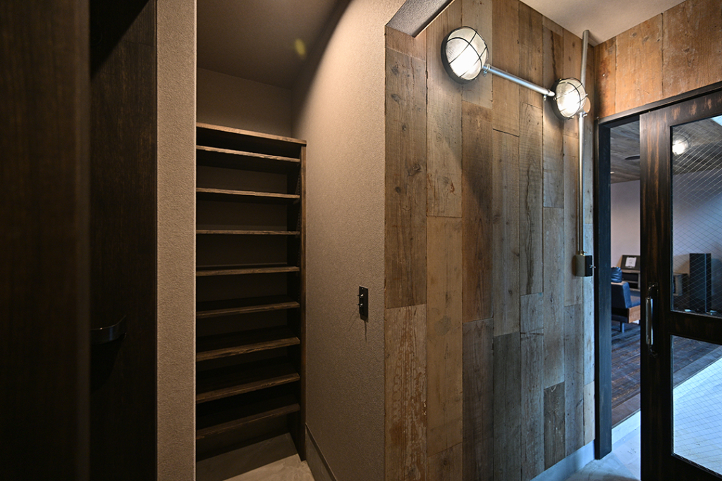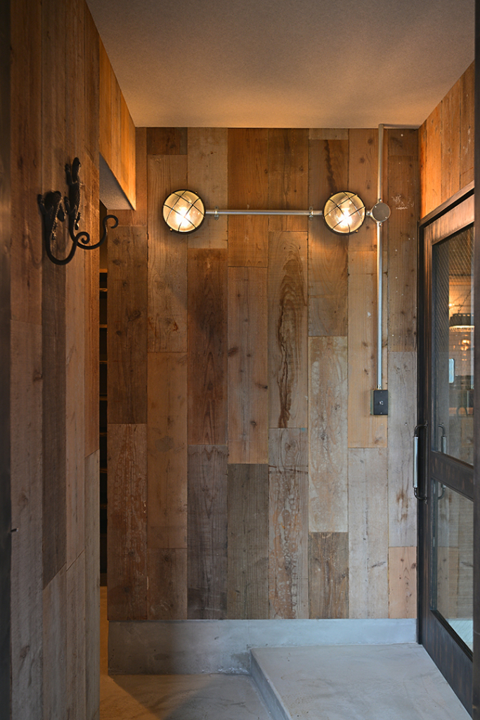 玄関の壁一面に古材を張り巡らせました。