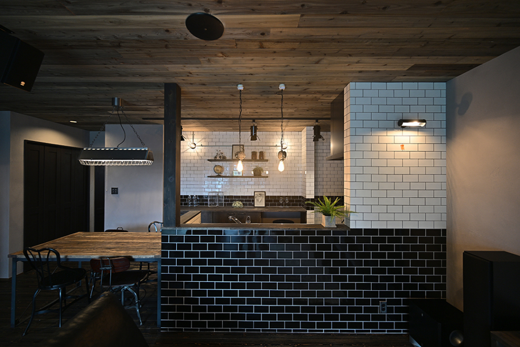 LDKはブラックのタイルをアクセントに落ち着いたトーンにまとめました。
