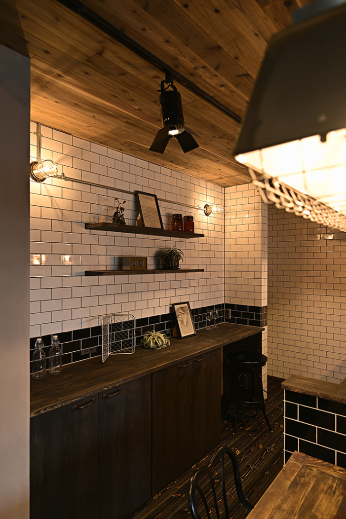 造作のバックカウンターの上にも、全面タイルを張り巡らせました。
