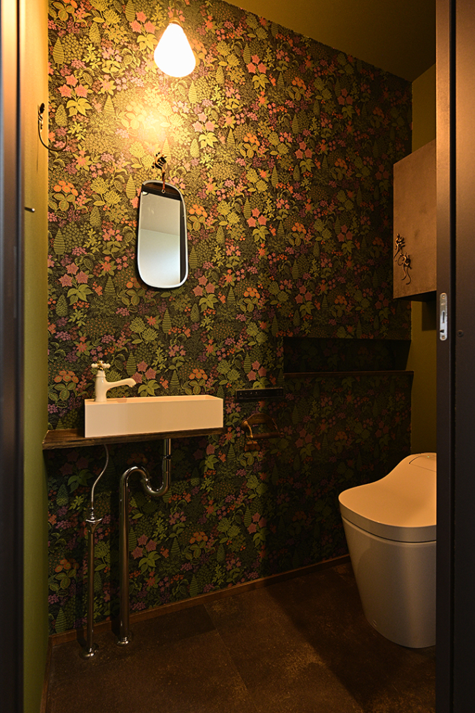 トイレにはフラワープリントのアクセントクロス。
