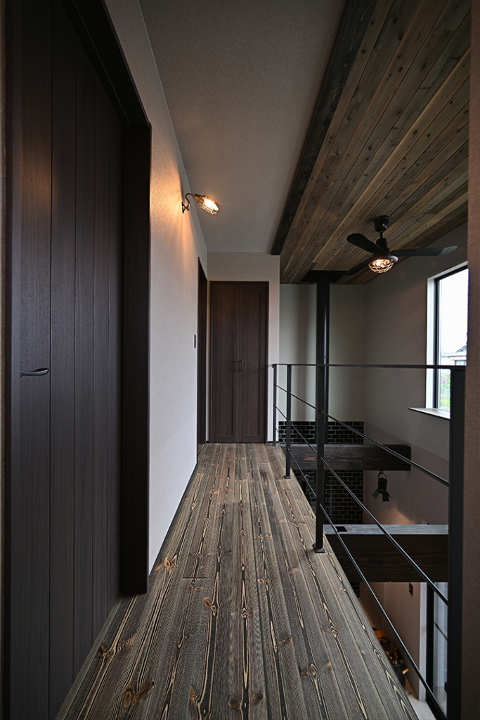二階の廊下も吹き抜けに面してアイアンのフラットバーにすることで、開放感と自然光が広がります。